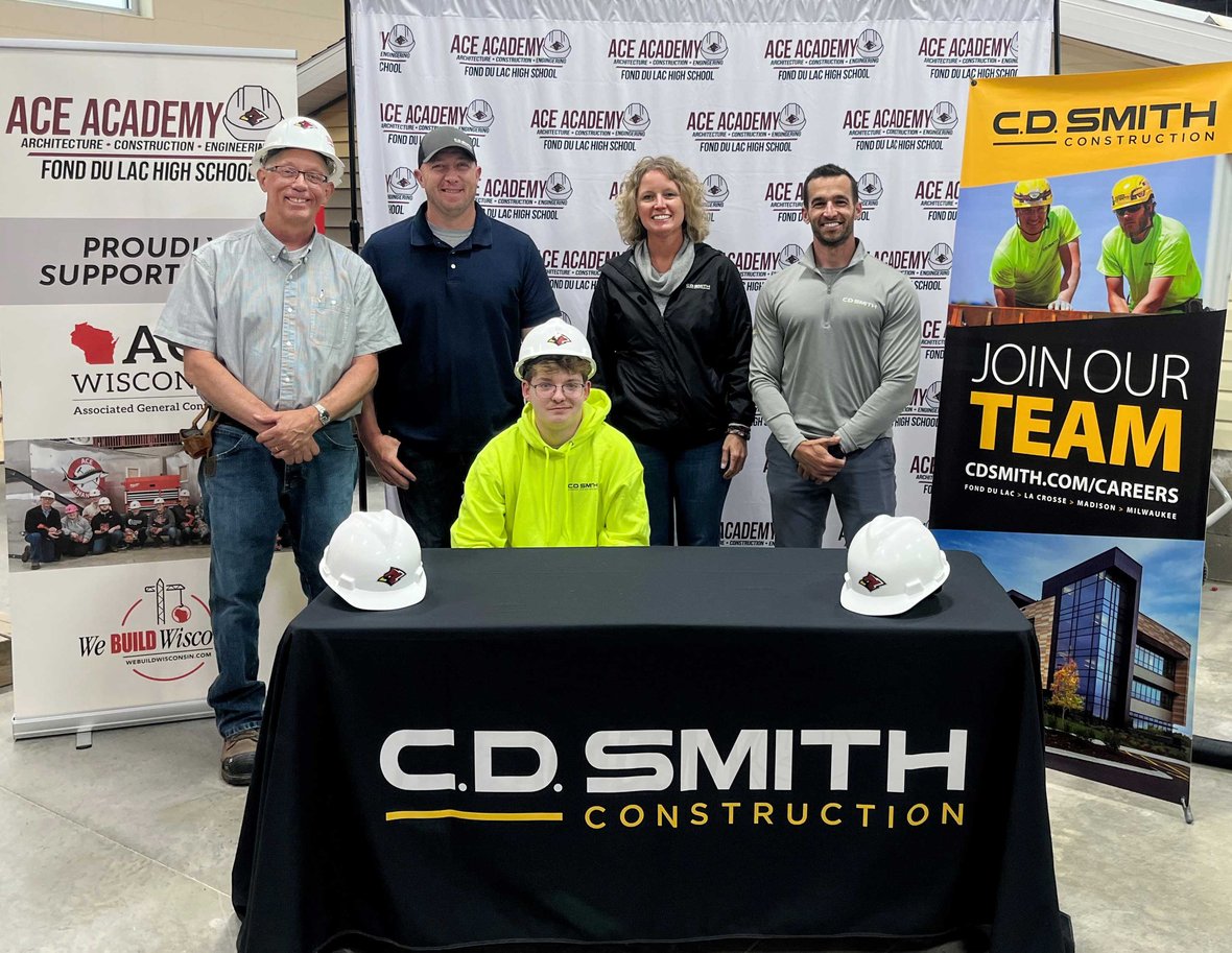 Fond du Lac High School ACE Academy signing event with instructor Vern Widmer, Gavin Bodart, Connie Coon, and C.J. Smith from C.D. Smith.