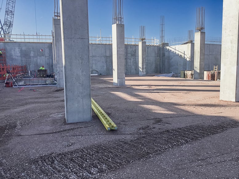 Construction progress on the Forensic Science and Protective Medicine Facility as of February 2024. Foundation work is in full swing as concrete foundation walls and columns take shape.