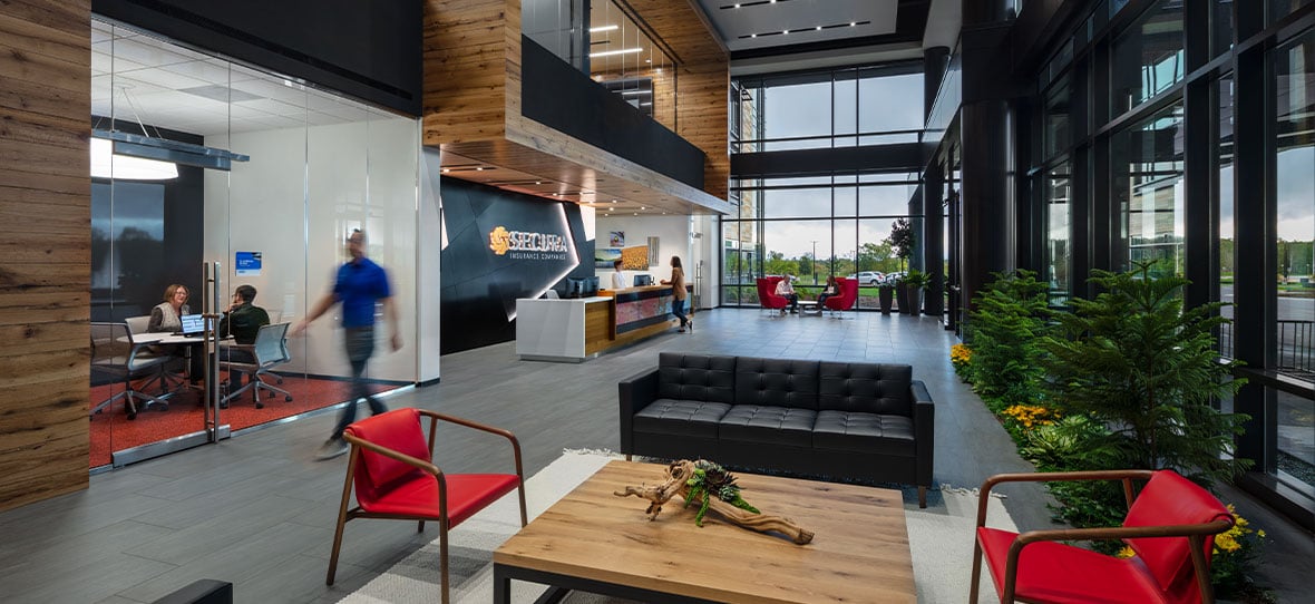 A large focus was put on sustainability and integrating green practices into the building, minimizing environmental impact while creating a workplace employees can be proud of. SECURA will also generate 15% of their own energy from the solar panel field adjacent to the office building.